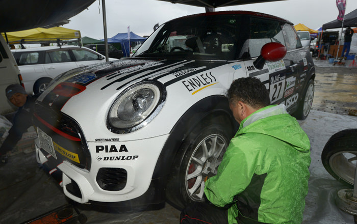 サービス後の「Minenohara 2」では、濃霧と豪雨が重なり時には10メートル先の視界がない状態となり、これにより大きくタイムを落としてしまった。その後、嬬恋村に戻っても状況は変わらず、ドライタイヤを装着した状態でヘヴィーウェットコンディションの「OmaeSuzaka UP 3」をなんとか走り切ってこの日最後のサービスへ戻った。ブレーキタッチを改善するためブレーキパッドを交換、クラス5番手でDay1を終えた。