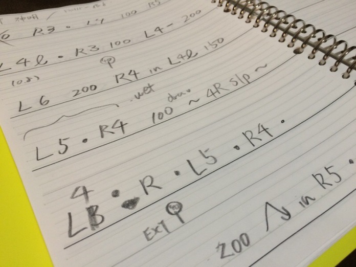(↓こちらがペースノート・・・レキという大会前の試走でドライバーと
